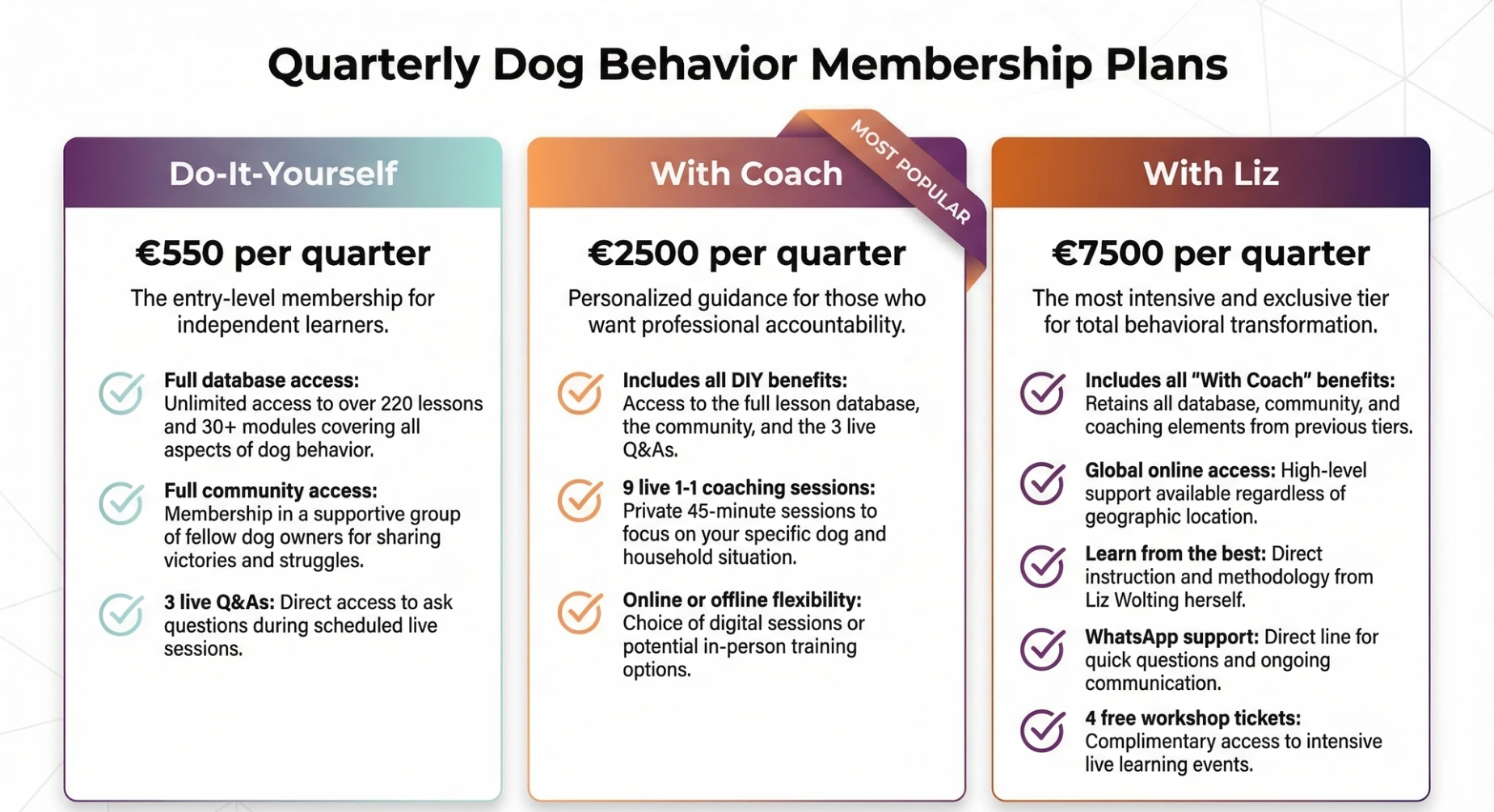 Join us live every month for coaching, Q&As, and in-depth guidance from Liz herself. Ask your questions, get clear answers, and learn how to take the right steps in the situations you and your dog face every day.